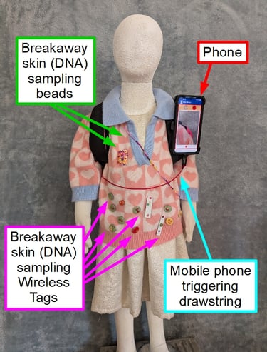 Many discs worn on the outside of clothing that rub off during an attack. These discs are wirelessly detectable by the police and take and hold samples of the kidnapper's skin.